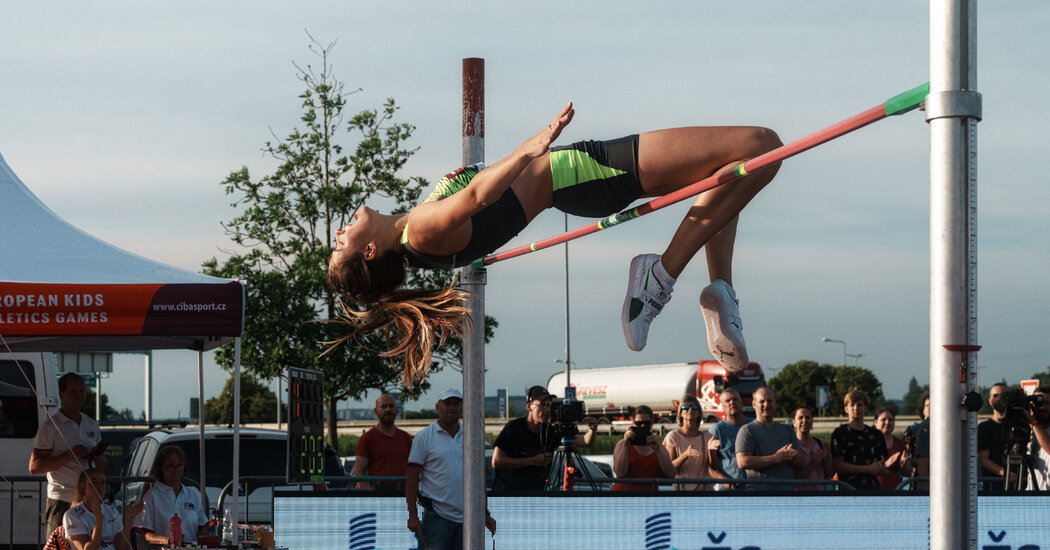 BRNO, Czech Republic — It was an unusual place to hold a high-jump competition — a parking lot outside a shopping mall in late June. Customers stopped briefly with their bags. A cluster of spectators, including Ukrainian war refugees finding a moment to cheer, stood along a railing. Human statues, painted gold, froze in poses as ancient Olympians. Cars and trucks whisked south on the highway toward Slovakia.